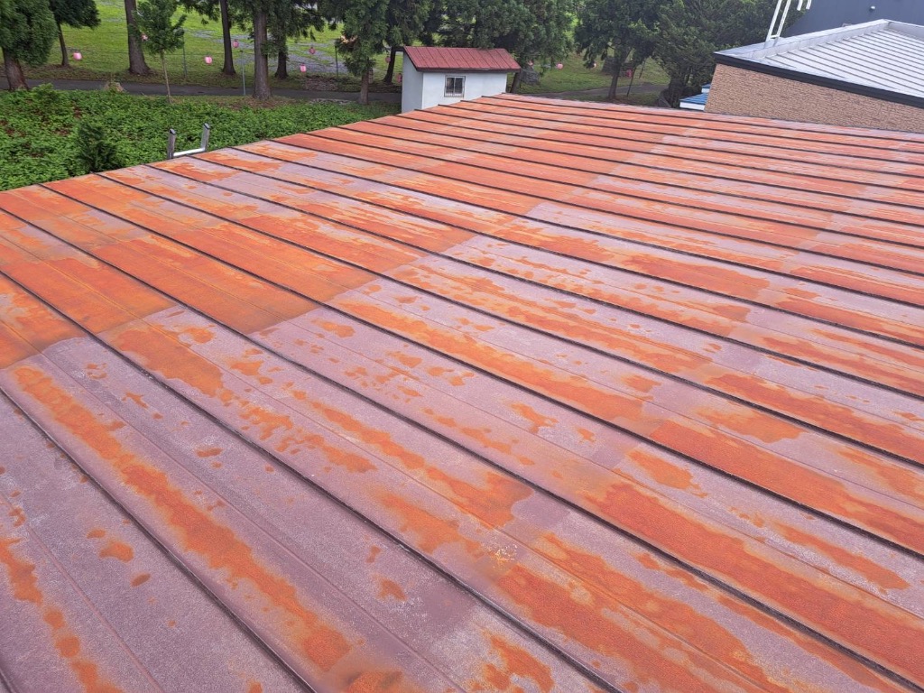 本屋根97.4m2、さがり26.1m2、破風30.5mですが、取壊しを考えているので、本屋根の錆止め塗装なしでお見積りすることにしました。